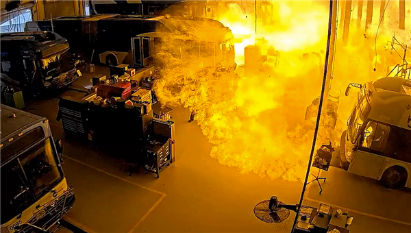 从监控视频拍摄的画面看☆◁,一辆公交车在液压升降机上维修时意外坠落,导致相邻的控制板刺穿CNG气瓶,释放的可燃气体与空气混合后被机械摩擦或电流点燃,引发爆燃和多次爆炸。