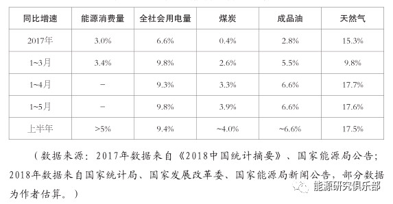 上半年国民经济延续稳中向好的发展态势,转型升级稳步推进▽,质量效益不断提升◁▽,经济增长的韧性、稳定性和可持续性不断增强●▪•。受宏观经济持续向好、○“冷冬+早夏”天气、环保督查等因素综合影响,2018年上半年能源消费延续了2017年的快速增长态势,电力、煤炭、天然气、成品油等主要能源品种均实现较快增长,二季度呈现“淡季不淡”特征▼…▽。初步估算,上半年全国能源消费同比增长超过5%(表 1),明显高于2017年全年增速◆。