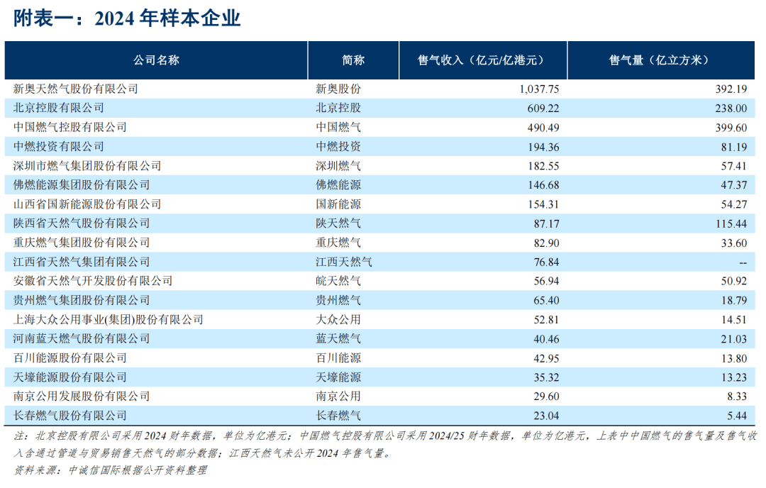 从2024年数据表现来看,城市燃气行业格局维持相对稳定,新奥股份、中国燃气等跨区域城市燃气运营商,特许经营权数量较多,且燃气项目多分布在天然气储量富足地区、经济较发达地区以及人口密集的省会城市或新兴城市,售气量和售气收入表现均较高;北京控股的城市燃气业务服务范围为北京市,区域市场优势显著,仍为全国最大的单体城市燃气供应商。国新能源、陕天然气、重庆燃气、皖天然气等燃气运营公司在直辖市、省内或经济特区处于垄断地位,售气量和售气收入规模处于第二梯队。长春燃气、南京公用等市级燃气运营商供气范围仅辐射某些地级市或者周围地区,售气量和售气收入相对较少。此外,供气范围所在区域也会影响燃气公司的售气收入,虽然2025年以来各地加快顺价机制调整,但目前东部地区的燃气价格整体相对较高,使得当地的燃气运营公司的售气收入相对较高。