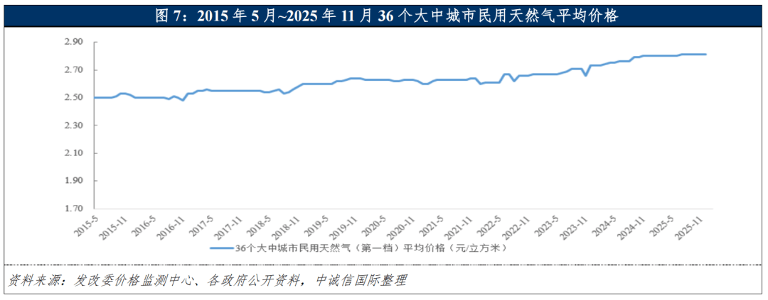 下业格局方面,因市场化程度相对较高,城燃企业仍呈现多元化竞争格局,以区域型国有企业、跨区域集团企业为主,中小民营企业为辅。2025年市场格局仍维持相对稳定,但预计在新版《基础设施和公用事业特许经营管理办法》政策红利的驱动下,未来城燃行业或将向规模化、规范化方向深度转型。价格方面,自城市燃气企业出现采购成本与销售价格倒挂的情况,各地政府相继推动天然气上下游价格联动机制加快落地,天然气终端销售价格涨幅明显,非居民气价已实现较为顺畅的联动调整,部分地区居民调价流程也做出了相应简化。截至2025年12月末,随着顺价机制深化,大部分城市已出台并执行居民顺价文件,覆盖率约95%;全国36个大中城市民用天然气(第一档)平均价格保持稳定,总的来看居民气价调整的滞后性仍存。近年来国家发改委和国家能源局发布天然气价格改革政策文件,并结合地方层面居民用气价格调整的实践进展,缩短居民用气价格调整周期、提升价格联动灵活性,已成为行业改革的核心政策着力点。后续配套政策的落地实施,将进一步增强居民气价调整的时效性,城市燃气企业面临的气价倒挂压力有望得到缓解,其购销价差的合理性亦将获得更强机制保障。