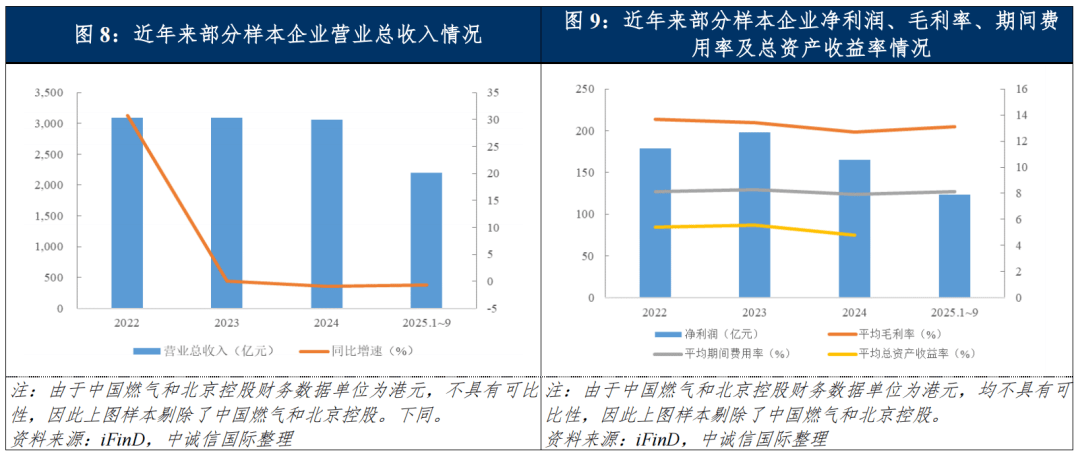 从盈利能力与效率来看,自“并轨”定价政策推行以来,上游气源价格与国际市场联动性增强,2024年购销价差整体修复,但部分区域仍受居民气价调整滞后影响呈局部性收窄态势,同时受房地产行业拖累,接驳业务量持续下滑,城市燃气企业盈利空间略有压缩。2024年,样本企业营业总收入同比减少0.96%,净利润同比下降16.46%;平均毛利率水平下滑0.75个百分点至12.68%。受2025年暖冬、工业需求阶段性偏弱等因素影响,前三季度全国天然气消费量呈微降态势,但顺价政策持续深化落实带动城燃企业盈利呈修复态势。2025年1~9月,样本企业营业总收入同比持续下降0.71%,平均毛利率水平小幅回升至13.12%,净利润同比小幅增长2.25%。2024年,样本企业减少职工薪酬、利息支出等以加强期间费用控制,平均期间费用率同比下降0.37个百分点。总资产收益率方面,由于营业毛利率的下降,2024年样本企业整体总资产收益率有所下降;且受资产结构、利润来源构成以及投资进度差异影响,样本企业总资产收益率差异较大,2024年新奥股份、蓝天燃气的总资产收益率超9%,而长春燃气、南京公用和天壕能源的总资产收益率均不超过2%。