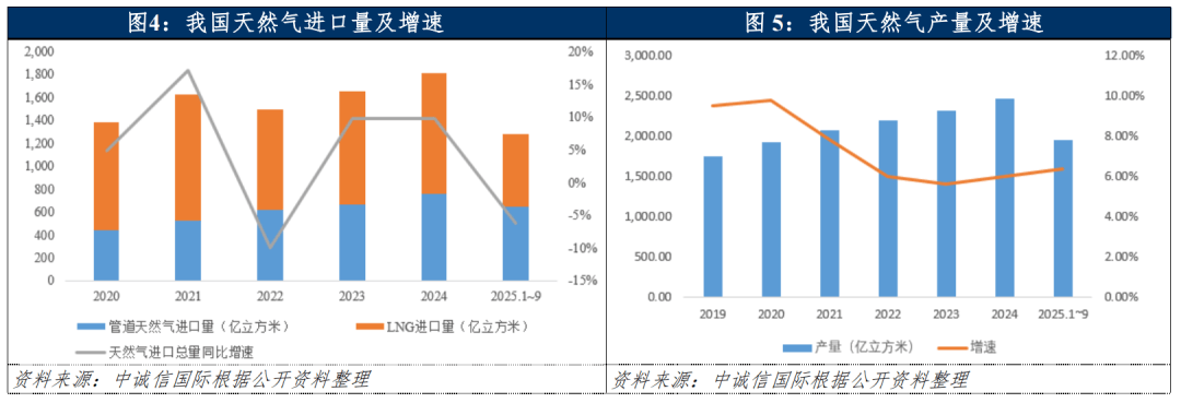 我国天然气对外依存度在国产气增储上产的推动下迎来积极变化。2024年,随着国际天然气价格回落,我国天然气进口总量显著回升,其中LNG进口占比约为58%。2025年1~9月,我国天然气对外依存度同比下降约2个百分点至40%,受工业用气需求阶段性偏弱,叠加国产气产能持续释放,我国天然气进口量有所下降,当期进口量1,281亿立方米,同比下降约6%,其中受中俄东线达产带动管道气进口量同比增长13%至655亿立方米;在国内天然气消费需求阶段性放缓的背景下,管道气进口的增量部分有效替代了LNG的市场空间,LNG进口同比大幅下降至627亿立方米。尽管对外依存度实现阶段性下降,但受资源禀赋和消费需求等因素影响,短期内仍难以从根本上扭转高依存的现状。