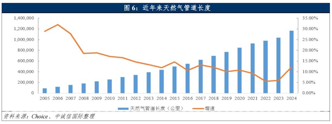 2024年末,全国天然气长输管道总里程12.8万千米,较上年末增加超4,000千米。川气东送二线月进气投产,推进川渝天然气资源与“全国一张网”更好融合,标志着我国横贯东西的天然气管道建设取得关键进展。中俄东线月正式全线年实现满负荷运行,年输气量达380亿立方米,通过与陕京管道、西气东输管道系统的互联互通,大幅提升长三角地区清洁能源供应保障能力。2025年我国已基本形成“四大战略通道+五纵五横”干线管网格局,未来西北、东北、西南、海上四大战略通道将持续完善,进一步织密覆盖全国的天然气输送网络。